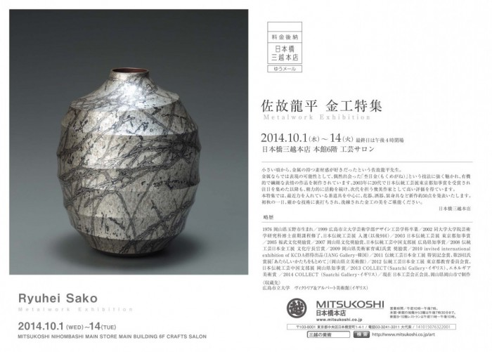 2014.8.31(sun) 個展情報 日本橋三越本店 本館6階工芸サロンにて個展を開催します 杢目金(もくめがね)という技法で制作した作品を中心に花器 茶器 酒器 装身具など約50点を展示予定です […] news